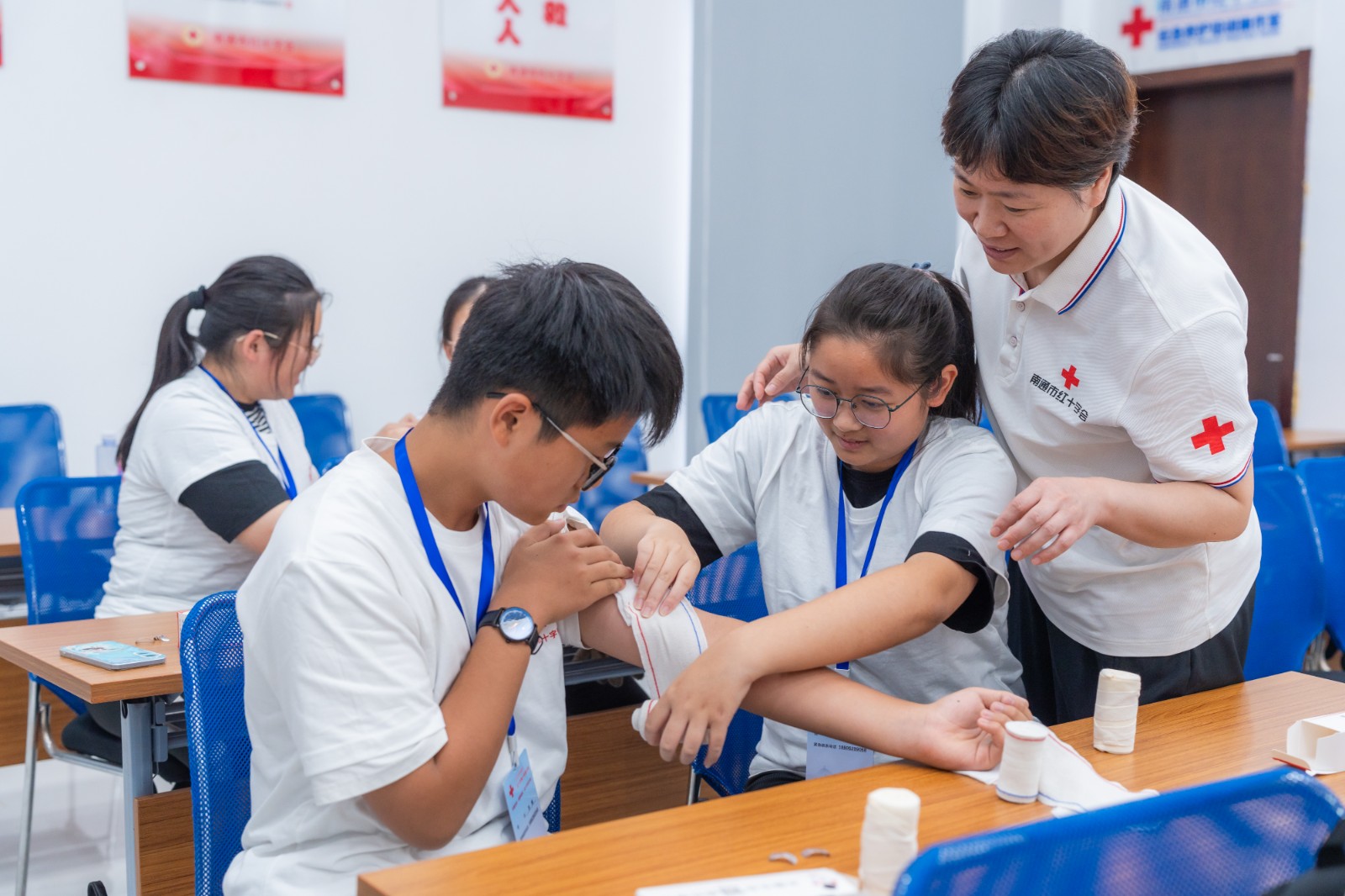 近年来,南通市红十字会高度重视中小学急救教育工作,与市教育局联合推动“救在身边校园守护”行动,实现了“五个全覆盖”,即:全市学校班主任、体育教师、校医、宿管员等群体持证救护培训全覆盖;高一、大一新生军训开展救护培训全覆盖;高校、高中阶段学校救护师资全覆盖;红十字青少年生命安全体验馆(教室)县市区全覆盖;各级各类学校AED配备全覆盖。