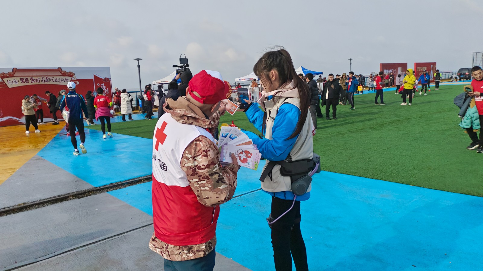 清晨初雪后的南通长江体育公园,虽江风凛冽,但处处洋溢着欢快与活力的节日氛围。身着队服的红十字志愿者们,成为迎新跑队伍中一道亮丽而温暖的风景线。他们之中,有成功捐献造血干细胞的爱心英雄,有长期坚守的“三献”宣传志愿服务队队员,也有专业的应急救护师资和赈济救援队队员。他们手持宣传牌、高扬队旗,在奔跑中传递健康向上的生命理念,播撒博爱奉献的希望火种。