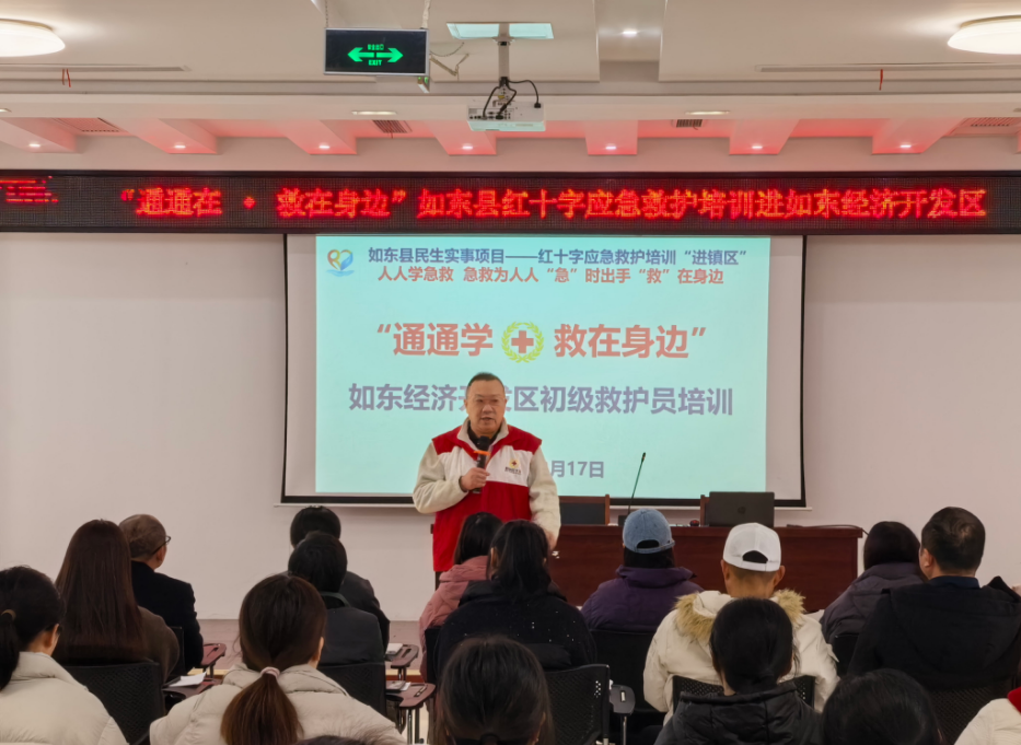 12月17日,如东经济开发区(高新区)邀请县红十字会周主任、陈主任和薛老师、孙老师在经开区为民服务中心二楼会议室举办了红十字初级救护员培训、考试,学员约60人。培训内容十分丰富,包括创伤救护(止血、包扎、固定、搬运)以及常见急症和意外伤害的急救方法等等。县红十字会讲师们通过理论讲解、实际操作和案例分析相结合的方式,深入浅出地向学员们传授急救知识。实操环节,学员们在老师的指导下,分组进行模拟练习。大家积极动手,认真操作。老师们穿梭于各小组之间,耐心纠错,手把手指导,确保每位学员都能掌握正确的急救技能。