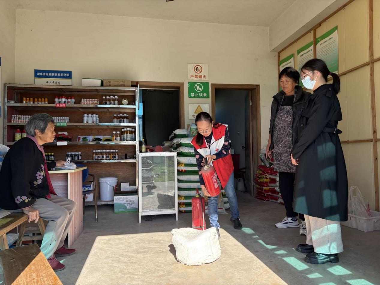 在核心的灭火实操环节,演练分别在村委会前坪及农资店设置了两处实战点。博爱家园志愿者首先向村民详细讲解了干粉灭火器的构造、有效期识别及“提、拔、握、压”四字使用口诀。随后,在博爱家园志愿者的专业指导下,大家轮流上场进行了灭火器实操体验。面对模拟火源,大家沉着冷静,按照操作步骤成功扑灭了火焰。