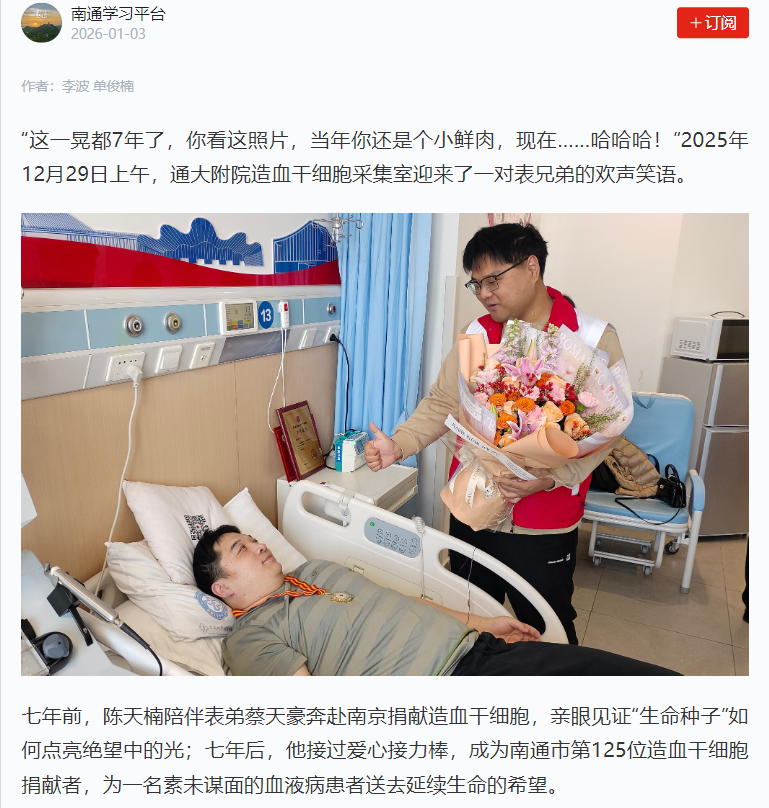 【学习强国】江苏南通:表兄弟相继捐献造血干细胞 七年完成爱心接力